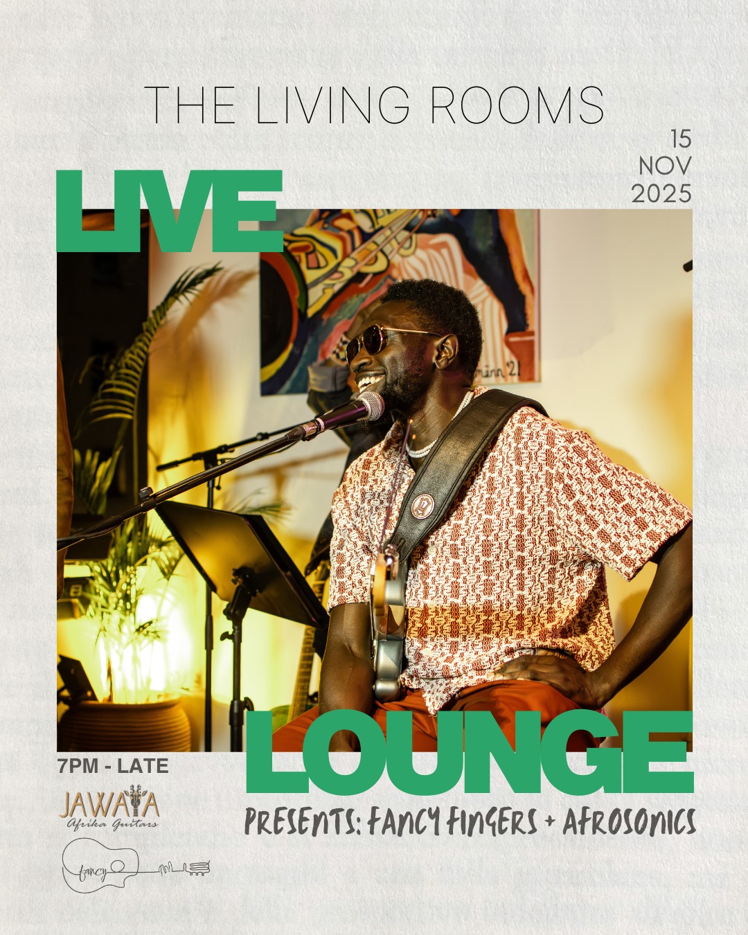 Presented by Jawaya Africa GuitarsJoin us for an intimate and deeply musical night as Fancy Fingers teams up with Afrosonics for a soul-stirring live set at The Living Rooms. Expect warm, immersive sound, lush instrumentation, and the kind of easy atmosphere that invites conversation, movement, and connection.