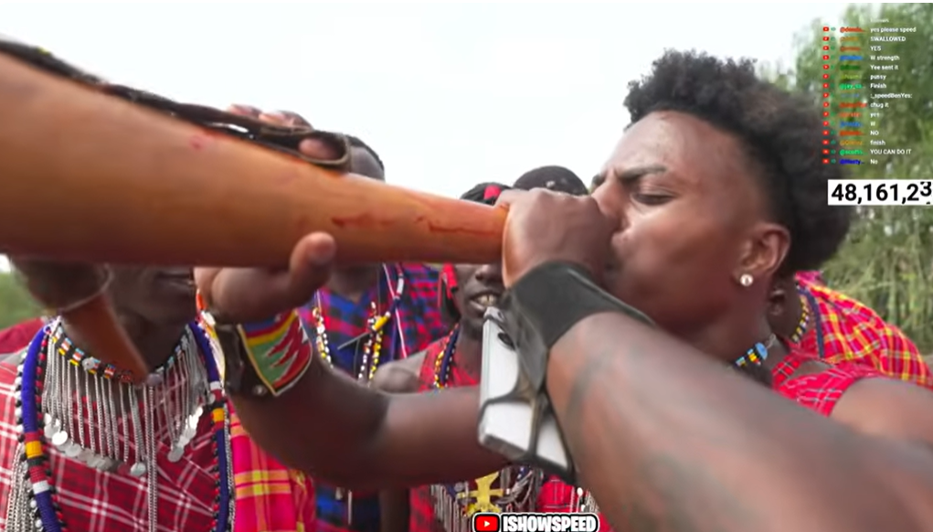 Clips and posts circulating from the Mara/Maasai segment also show Speed being encouraged to try a traditional Maasai mixture of milk and cow blood (often shared online as a “Maasai milk and blood” moment).