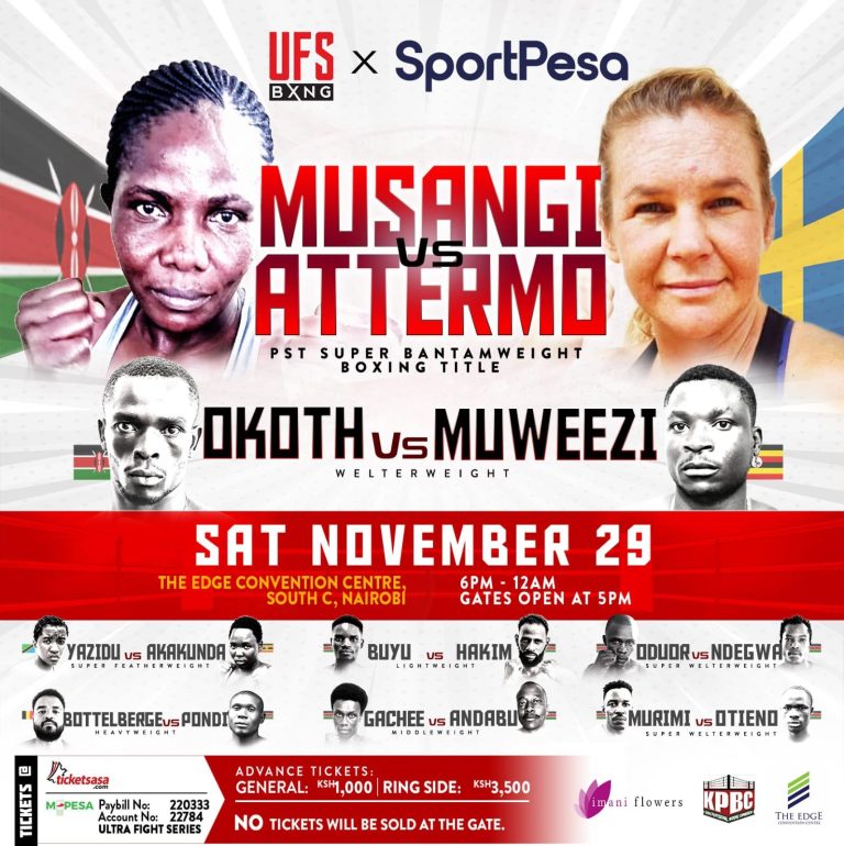 The main event features Kenya’s own Consolata Musangi battling Sweden’s Sandra Attermo for the PST Super Bantamweight Title — a clash of champions that promises explosive energy and heart-pounding drama inside the ring.